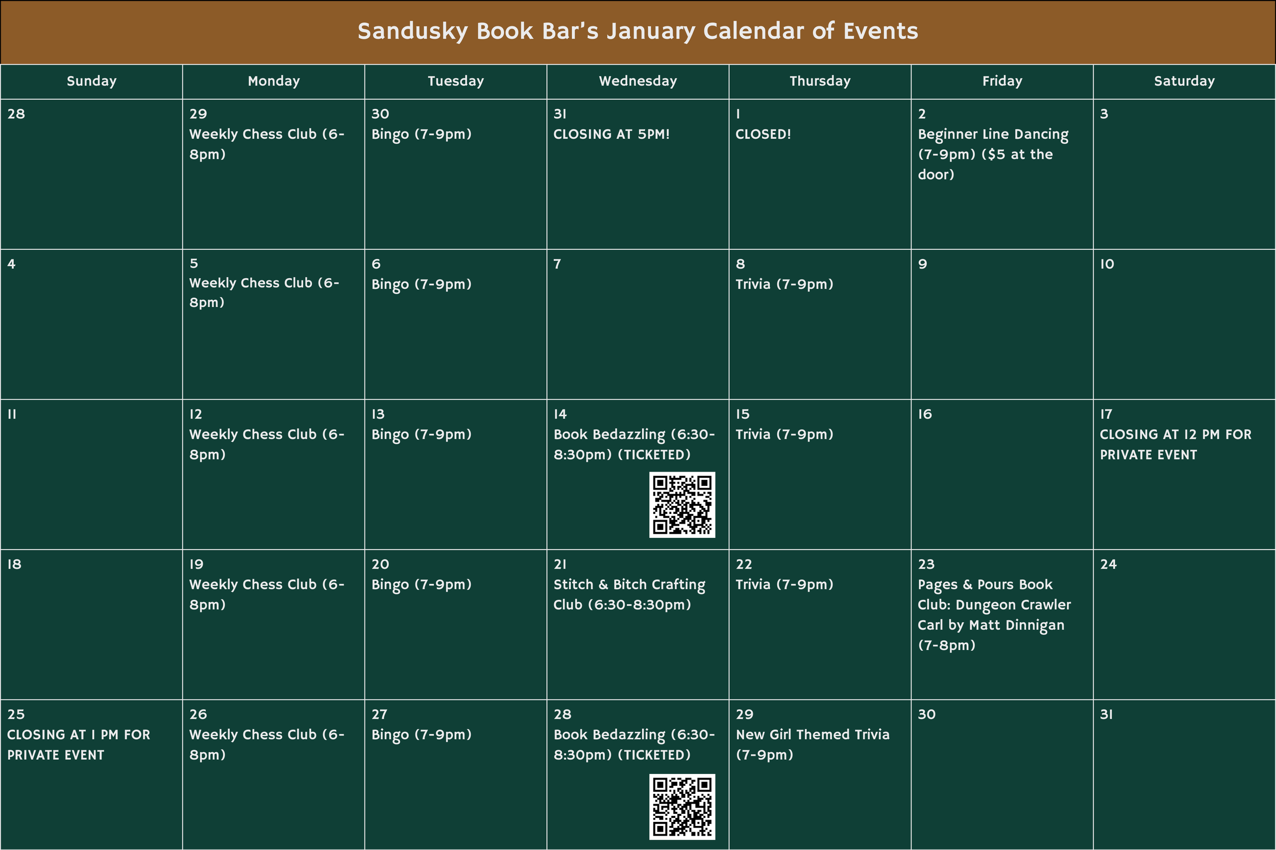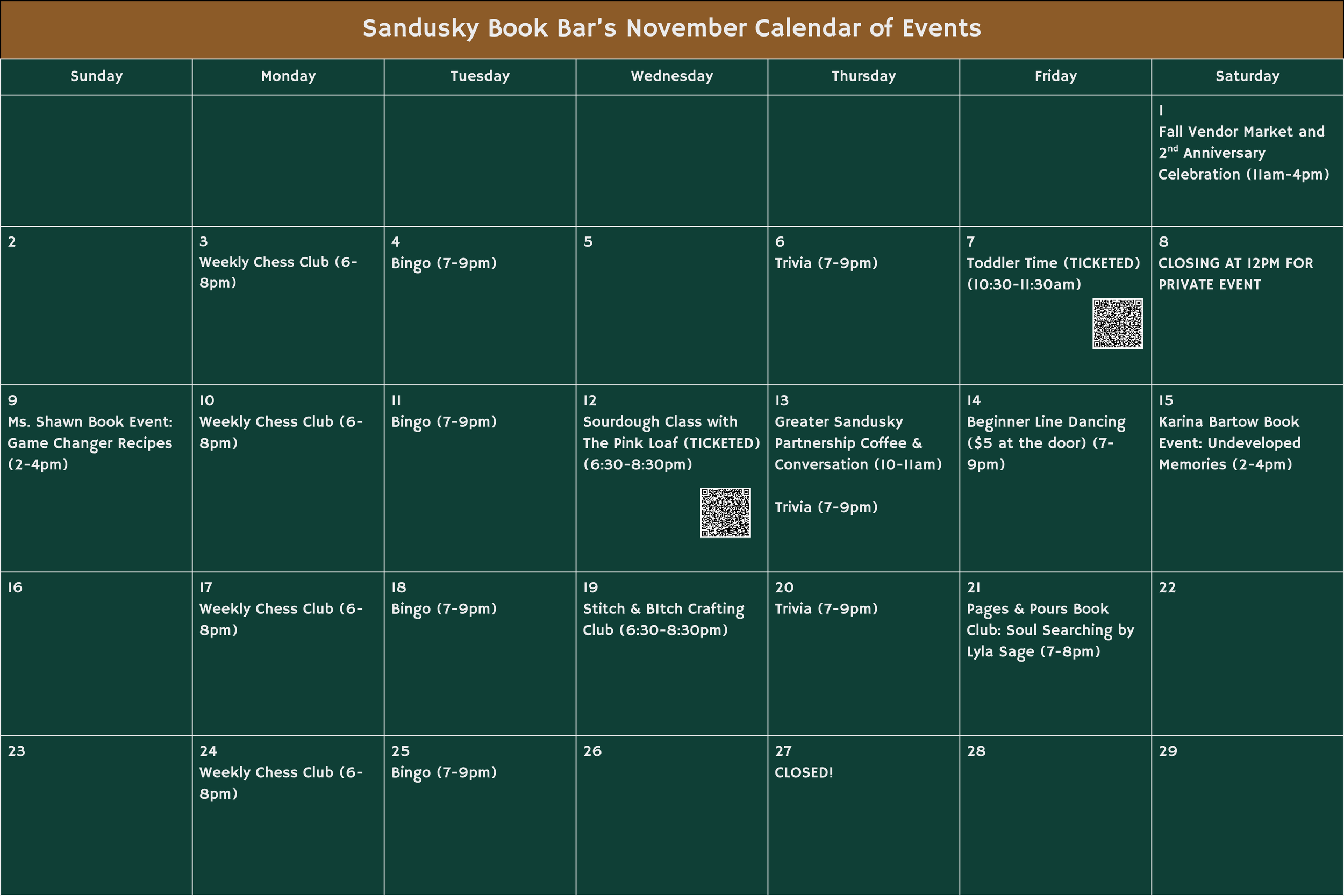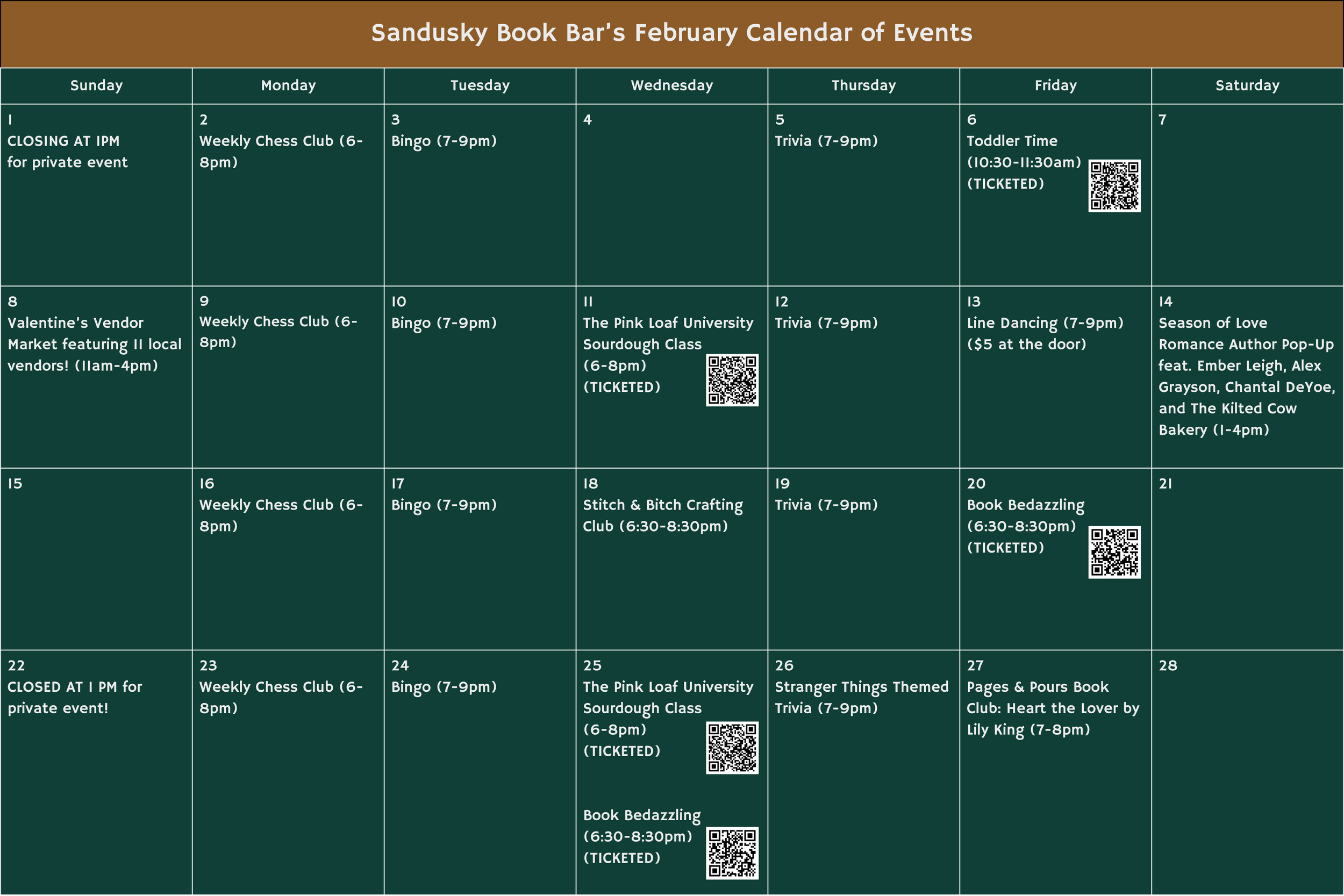 Sandusky Book Bar is a coffeeshop, full bar, and bookstore (used, new, and local author features). We also have fresh floral arrangements, bagels and cheese boards, pastries, and seasonal drinks!