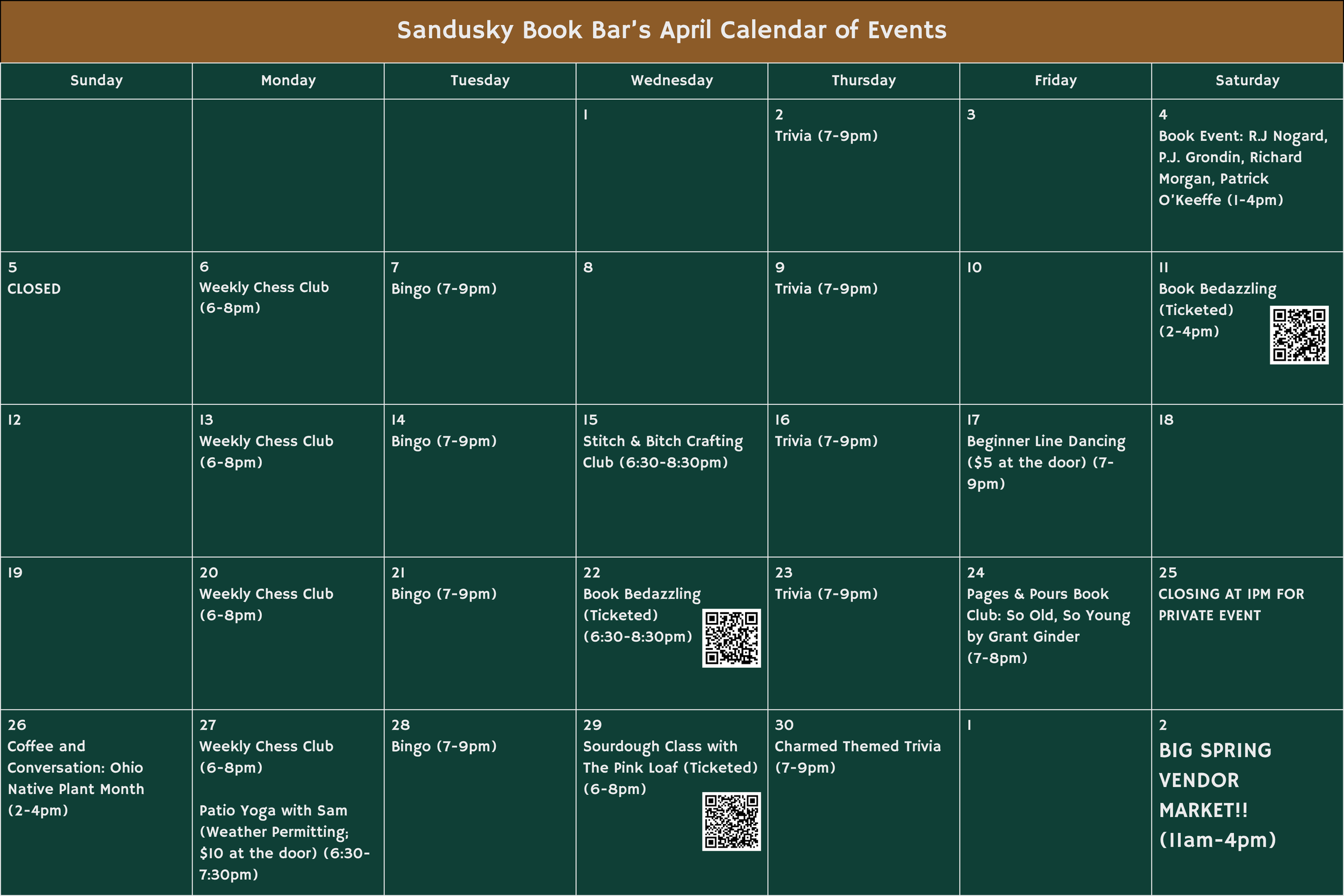 Sandusky Book Bar is a coffeeshop, full bar, and bookstore (new, used, and local author features). We also have fresh floral arrangements, an assortment of food, and seasonal drinks!